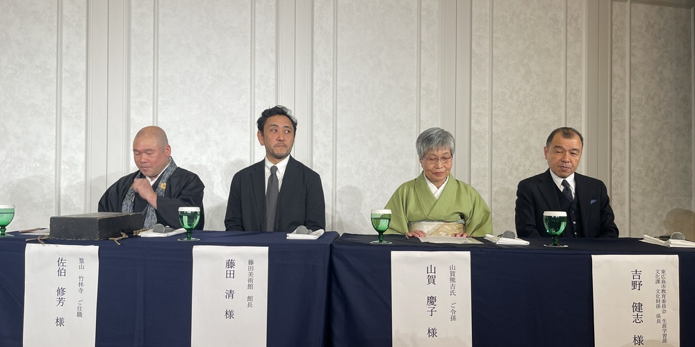 三重塔に縁のある4人が移築の歴史を振り返りエピソードを語った。左から佐伯修芳氏(竹林寺住職)、藤田清氏(藤田美術館館長)、 山賀慶子氏(山賀熊吉氏孫)、吉野健志氏(東広島市教育委員会)。