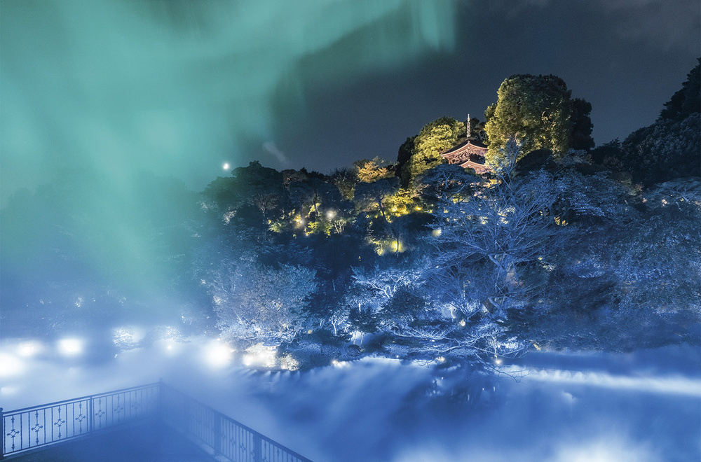 三重塔移築100年を記念して1月8日より始まる「天空のパゴダ」は、人気の庭園演出「東京雲海」をさらに拡張した新たな演出で、通年で行われます。これは、三重塔が当初建っていた竹林寺の霧の風景にインスピレーションを得たもので、塔前の芝エリアや周囲に霧を出現させることで、雲の上に佇む三重塔の幻想的な絶景を演出。一面の白い霧の中に荘厳な塔の姿が浮かぶ神秘的な光景は、鑑賞者の心を惹き付けてやみません。演出は1回約5分ほど、朝7時10分の回から22時40分の回まで1日9回行われます。夜はライティングも加わってさらに幻想的な三重塔を眺められます。
