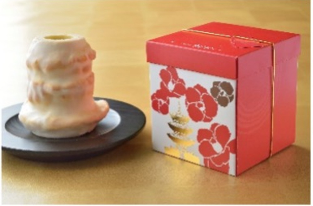 2025年限定のパッケージにて販売されるバウムクーヘンはフォルムも三重塔のよう。