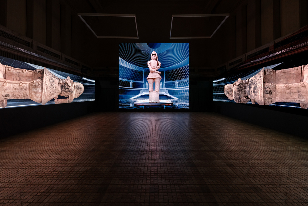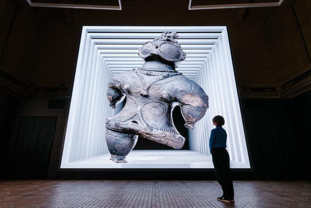 高精細映像による文化財を3方向のモニターで鑑賞。国宝「埴輪挂甲の武人」群馬県太田市飯塚町出土 古墳時代・6世紀 東京国立博物館蔵。