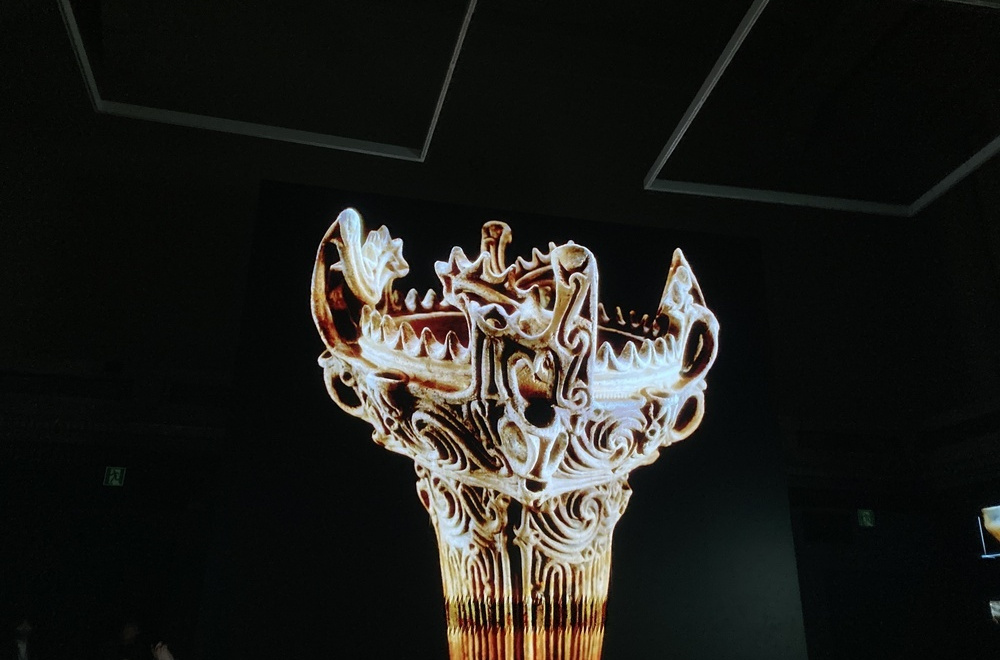 大モニターいっぱいに映し出される姿は何とも幻想的。 国宝「火焔型土器」 新潟県十日町市 笹山遺跡出土 縄文時代(中期)・前3000~前2000年 新潟・十日町市(十日町博物館保管)