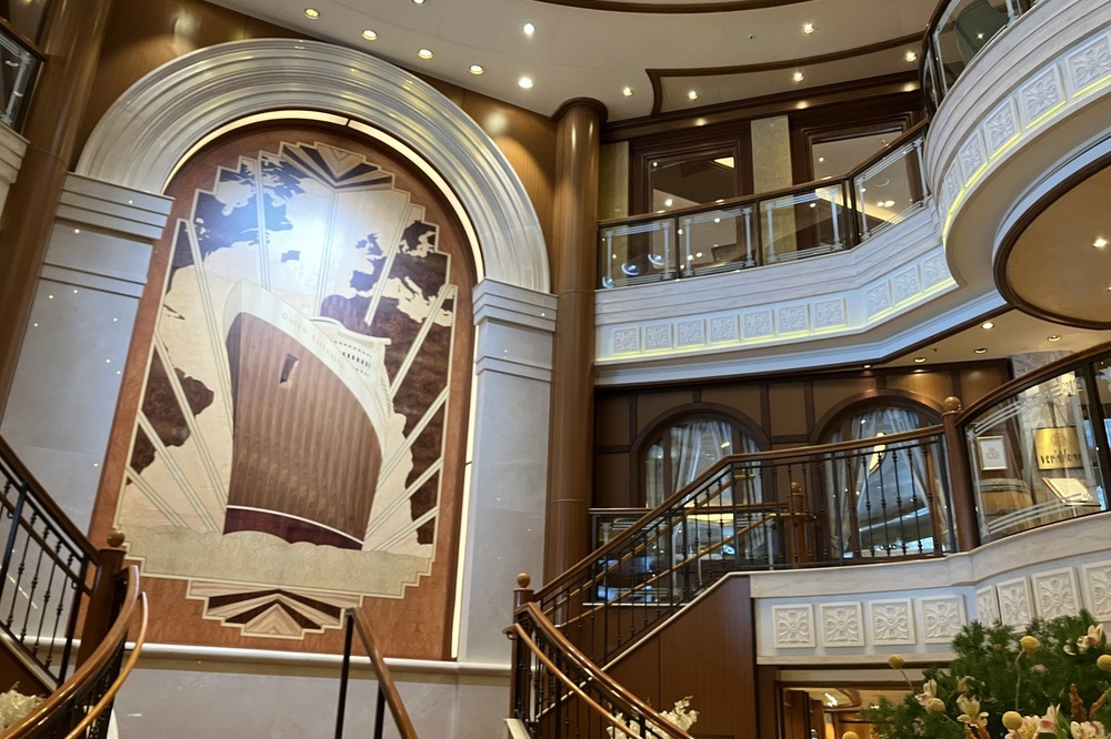 全長294mという大型客船の中は、長い船旅の間も飽きさせることのない豪華な施設やサービスにあふれています。スロットや専用テーブルが並ぶ「エンパイアカジノ」、ゴージャスなパーティが開催される「クイーンズ・ルーム」、約800名が収容できる劇場「ロイヤル・コート・シアター」、3層吹き抜けの「グランド・ロビー」など見どころがいっぱい。英国のエレガントな雰囲気を堪能できる、夢のような空間が広がります。装飾品も美しく、特に「グランド・ロビー」の階段に飾られた「初代クイーン・エリザベス」をモチーフにした寄木細工は圧巻です。