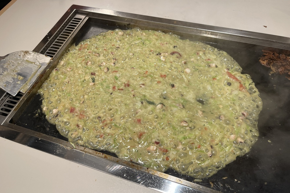 焼くとグリーンのもんじゃになる。