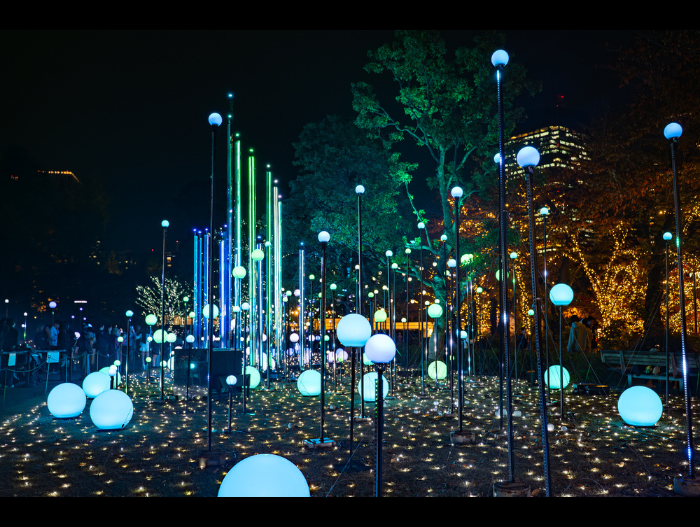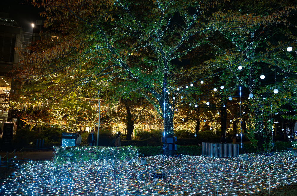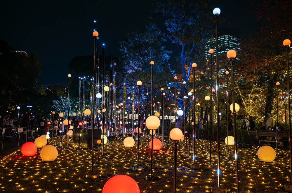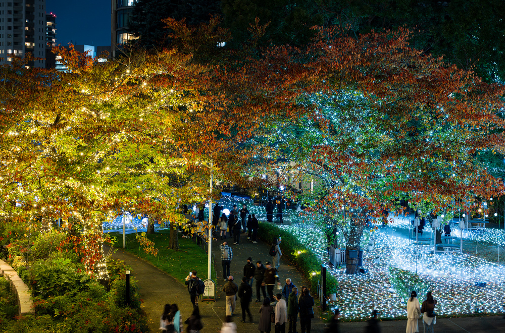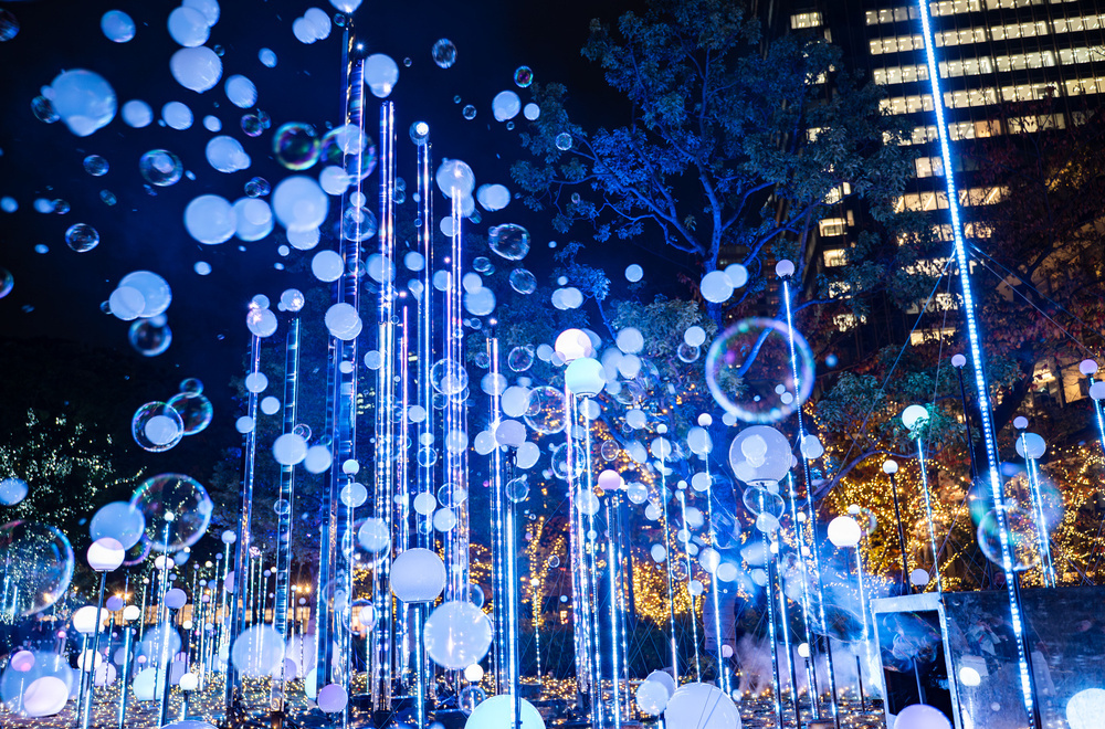 昨年も大好調だった、ミッドタウン・ガーデンのイルミネーション「CHRISTMAS GARDEN LIGHTS」。庭園に設置されたポールと球体のイルミネーションが、オリジナルの楽曲と連動してきらめく風景は、まさに息を呑むような美しさです。そして3分に1回、しゃぼん玉が飛ぶ演出が行われ、より一層幻想的な雰囲気に。また、芝生広場に近い方のエリアでは、12分に1回、雪が舞う演出が行われ、ホワイトクリスマスの気分を味わえます。なお、しゃぼん玉と雪の演出は12月12日(金)までの期間限定のイベントとなるので、どうぞお見逃しなく。