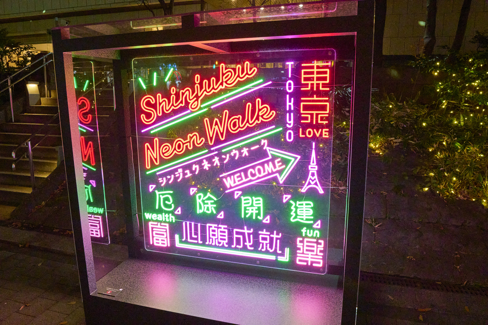 ただいま、中央通り(新宿副都心4号街路)地下道出口から都庁通り(11号街路下)までの全長約200mの間では、最先端のアートイルミネーションを体感できる「Shinjuku Neon Walk」が開催中。「TOKYO カルチャーミクスチャー」をテーマに、江戸から続く伝統文化とAIなど最新技術を駆使した革新的な文化を融合させ光で表現したこのイベントは、見る人の心を躍らせる仕掛けがいっぱいです。