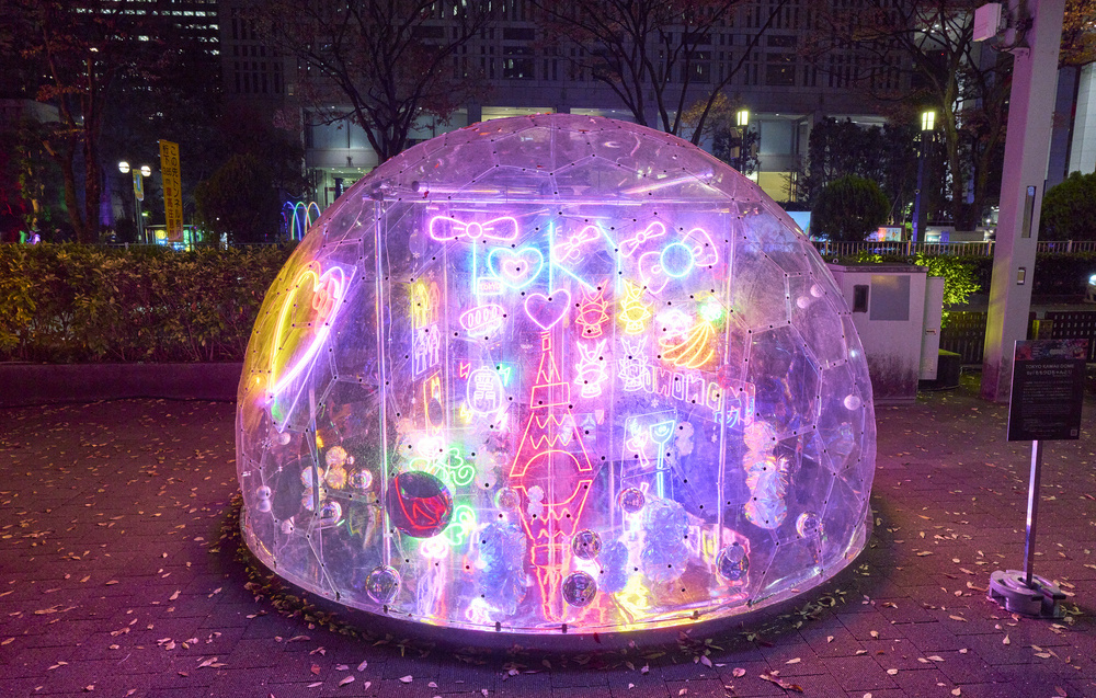 Zone-D(新宿住友ビル)では、テレビ朝日の人気番組「ももクロちゃんと!」とコラボした「TOKYO KAWAII DOME」が登場。ももいろクローバーZのメンバーが「東京&カワイイ」をイメージして描いたというイラストがネオンになってぎゅっと詰まったドームは、まさにももクロの世界観そのもの。見るだけでテンションが上がりそうです。このゾーンでは、そのほか2本の樹木を使った「Echo Trees ‐はじまりとおわりの呼応‐ 」「Twin Trees ‐恋弁天のヒカリ‐」の2作品も鑑賞できます。
