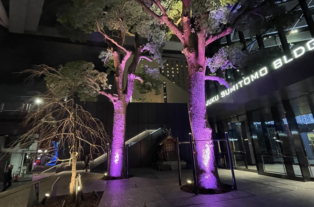 新宿住友ビル前の2本の楠をライトアップした「Twin Trees」。