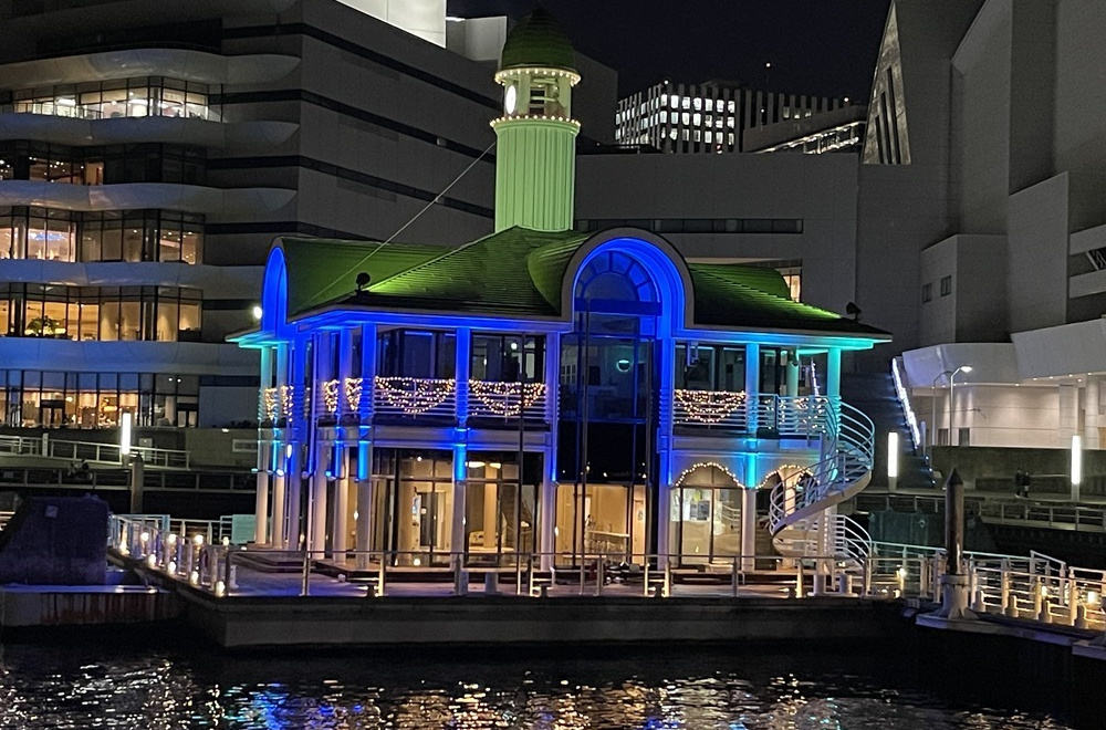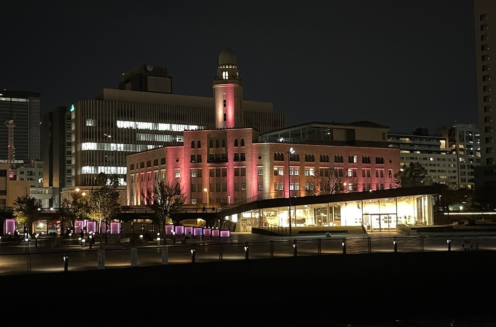 大さん橋入口にある「大さん橋ふ頭ビル」もヨルノヨのライトアップ。