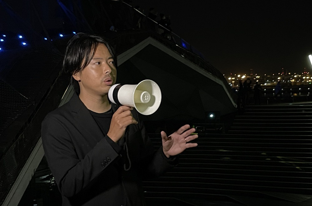 ヨルノヨのクリエイティブディレクター・山崎なし氏がプロジェクトの概要を説明(大さん橋会場にて)。