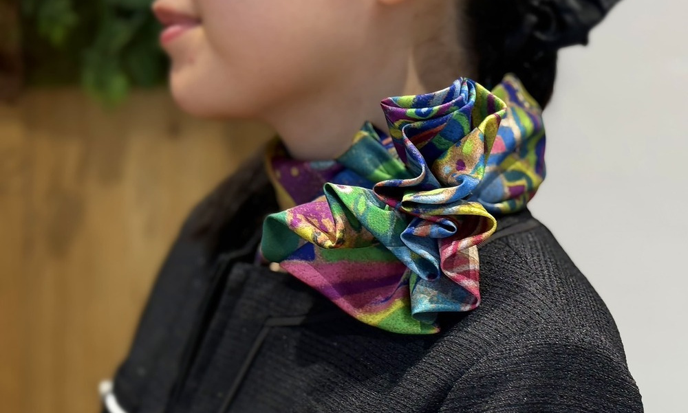 アートの彩りをまとったオリジナルスカーフを着用し、出迎えてくれる。