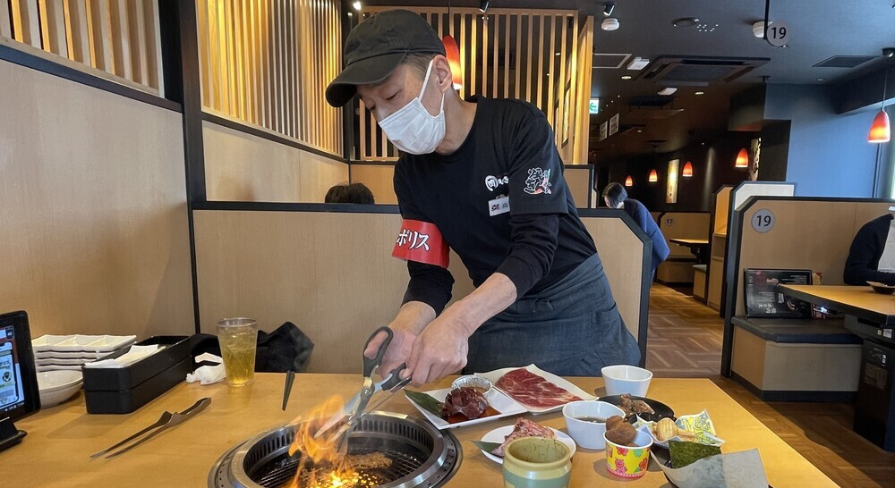 焼肉店では、肉の焼き方、焼き加減、食べ方に「これでいいのかな?」と、とまどうことがあります。焼肉初心者であればこれはなおさらのこと。そんなとき、「焼肉きんぐ」では、「おせっかいマスター」という社内資格を持つスタッフが、親切に教えてくれ、時には実演して焼いてくれるので安心です。今回は、「おせっかいマスター」の高橋さんが、みごとな手さばきで「【名物】長い!!23㎝ 壺漬けドラゴンハラミ」を焼いてカットしてくれました。