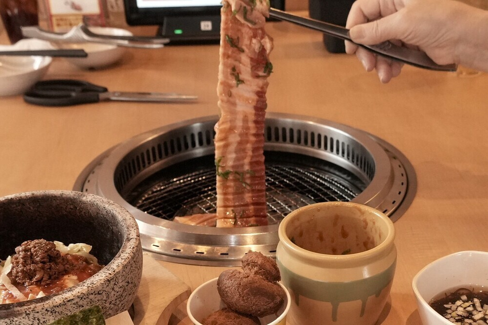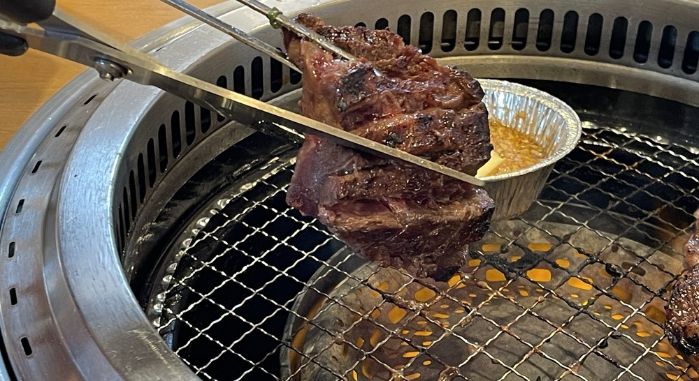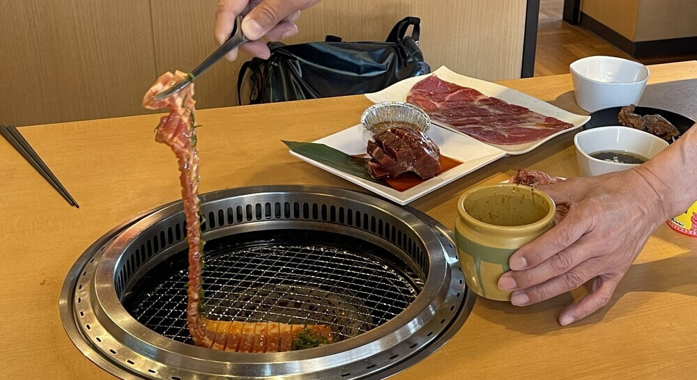 大きな肉は、網の上でじっくり焼き、ハサミで食べやすい大きさにチョキチョキ切り、十分焼いて食べます。長いカルビはトングで持ち上げて網の上に螺旋状に置き、食べるときにハサミで切って食べます。