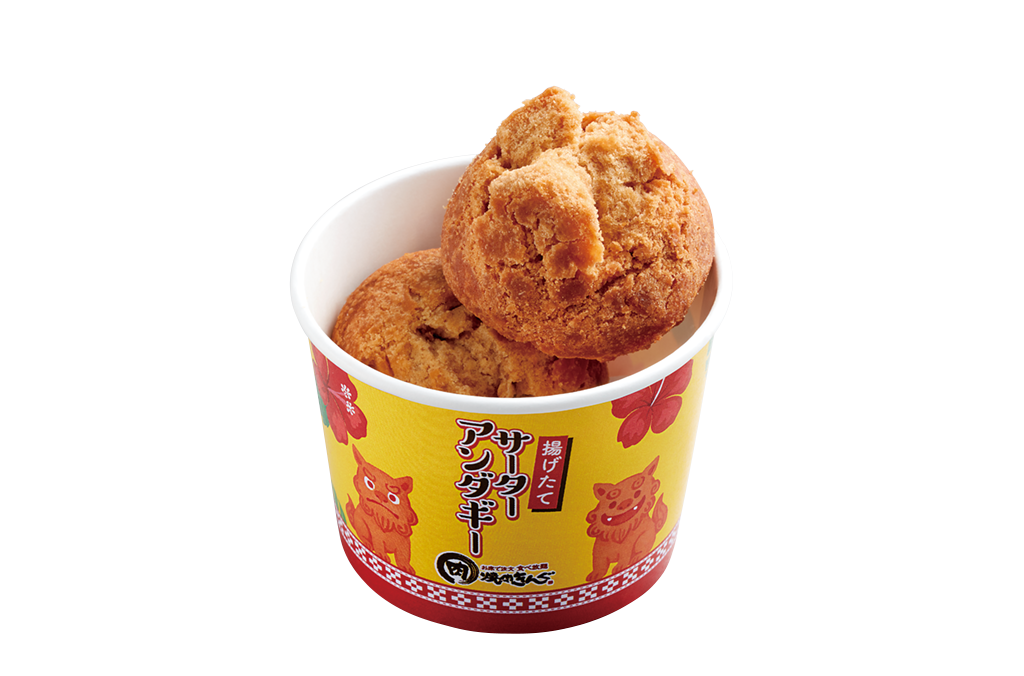 「揚げたてサーターアンダギー」。揚げたてはとんでもなく美味しいのでぜひ注文を!
