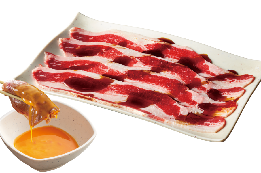 「【名物】炙りすき焼カルビ」は、卵にくぐらせて食べると絶品。