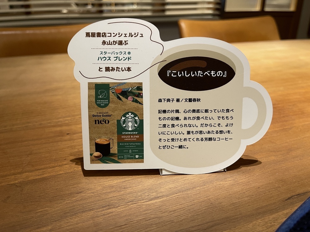 蔦屋書店のコンシェルジュ永山さんが、コーヒーメニューごとに選んだ本の紹介POP。