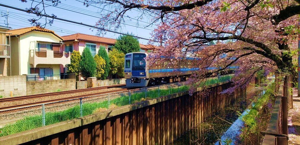 武蔵境駅付近、石神井川沿いの桜並木を走る。【西武鉄道】