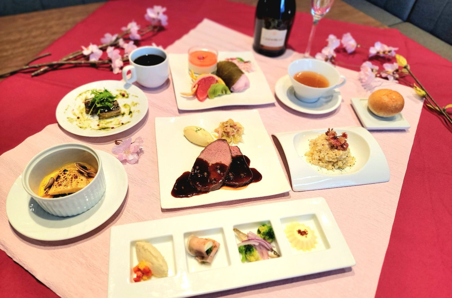 フレンチコースは菜の花の生ハム巻きや桜エビのコンソメスープ、チーズリゾットなど。