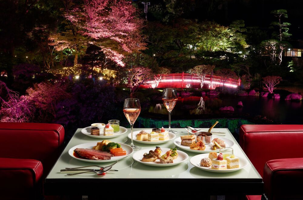 庭園を眼前に望むラウンジでは週末限定で「夜桜LOUNGE」などのナイト営業を予定。