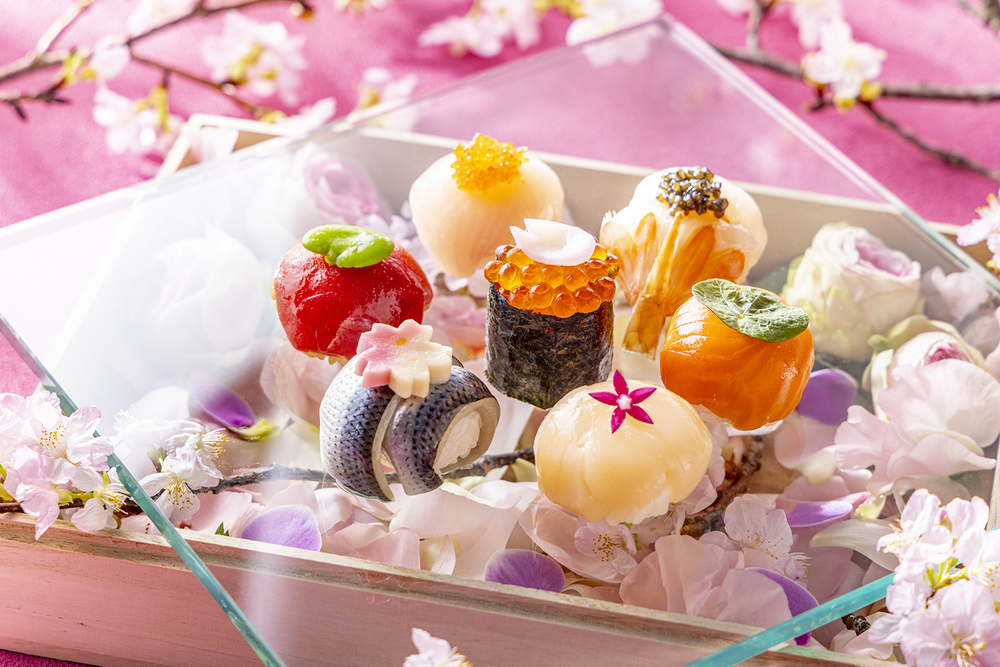ヒルトン東京2階の日本料理店「十二颯」の春限定のランチはアフタヌーンティーのような華やかな内容になります。一般的な寿司よりも小ぶりで丸くて愛らしい7種の「手まり寿司」は職人によってひとつひとつ丁寧に作りあげられていて、目と舌の両方でゆっくり味わいたい品々。日本料理店ならではの「先付」や「お造り」と一緒に楽しんだ後は、オリジナルの花フレーバーの煎茶とパフェでティータイム。本格日本料理をアフタヌーン気分でカジュアルに楽しめます。