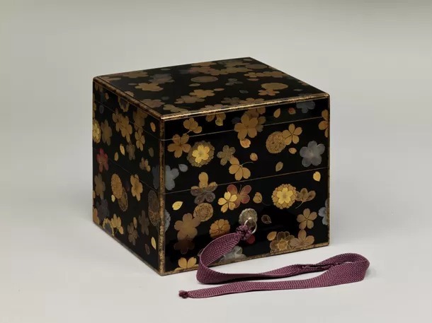 あでやかなな黒漆塗の蒔絵の香箱「桜蒔絵十種香箱」。