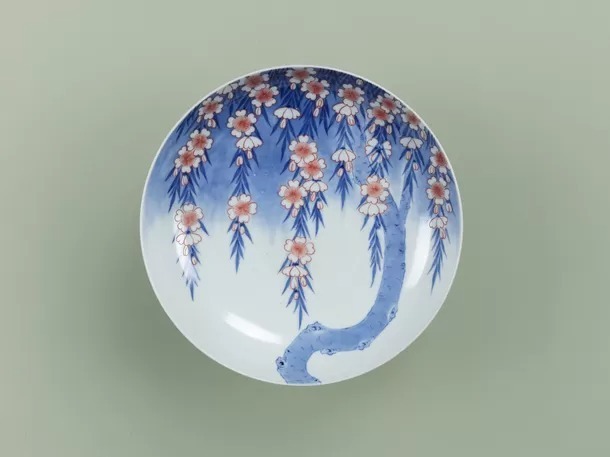 枝垂れ桜を描いた鍋島焼の組皿「色絵枝垂桜図皿」。