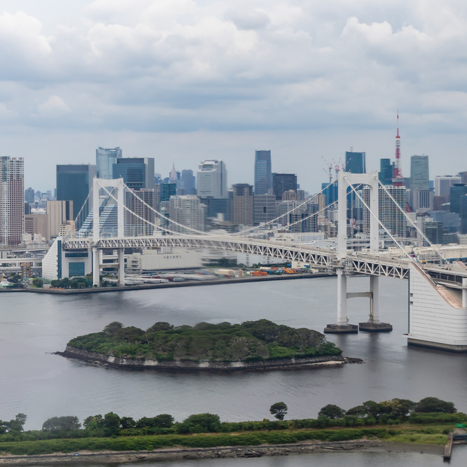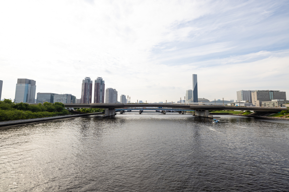 臨海副都心を東西方向に結ぶ全長360m、最大幅60mの歩行者・自転車専用橋。広々とした橋を渡ると、北側にお台場ビル群の近未来的な風景、南側に運河と倉庫街の風景が眺められます。橋は「祭りのにぎわい」をコンセプトに設計され、江戸火消しのまといや日本庭園の灯ろうを象った個性的な照明などが見られます。