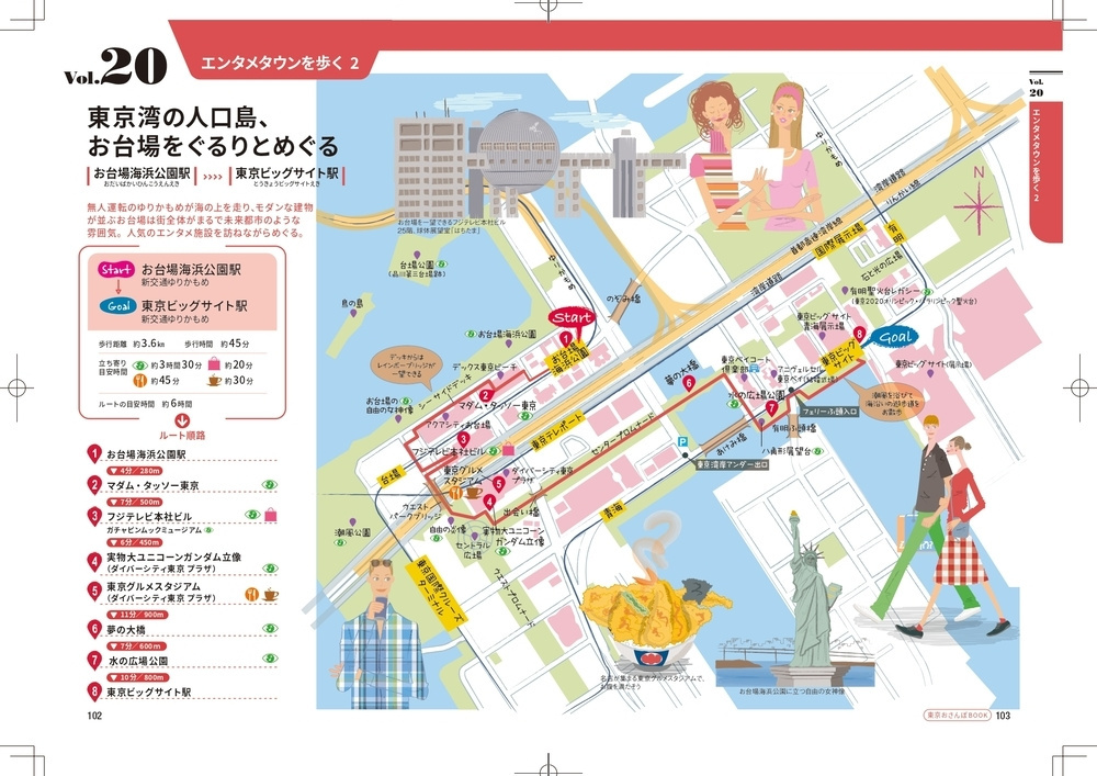 無人列車のゆりかもめが海の上を走り、モダンな建物が並ぶお台場は、街全体がまるで未来都市のような雰囲気。ここには、デックス東京ビーチ、ダイバーシティ東京プラザといった大型商業施設が並び、子どもから大人まで楽しめる話題のアトラクションが集まっている。今回はお台場海浜公園駅からスタートし、人気の施設を訪ねながら東京ビッグサイト駅までぐるりと歩く。街のあちらこちらで出合えるエンターテインメントな演出に心躍らせると同時に、ウォーターフロントならではの自然の風景も満喫できる、至福のお散歩時間を楽しもう。