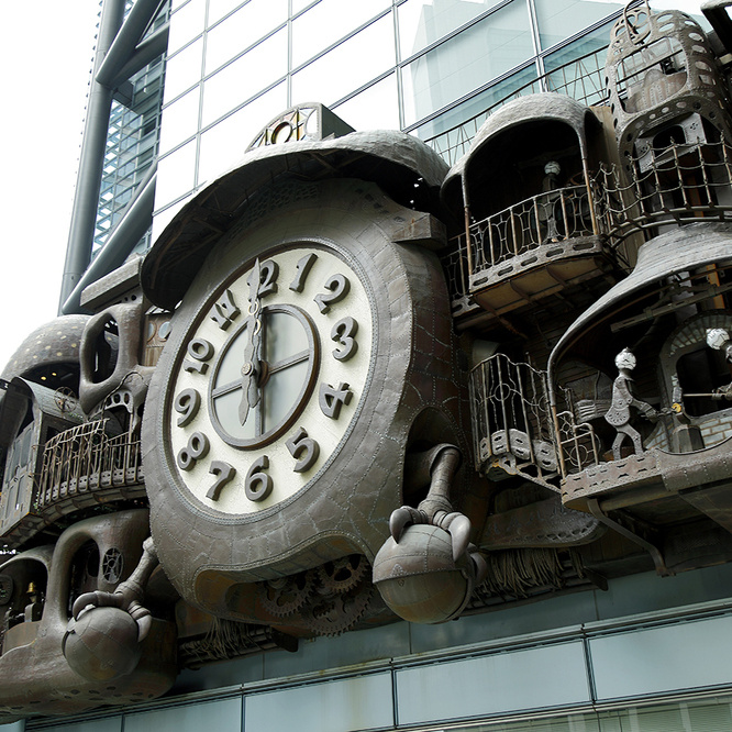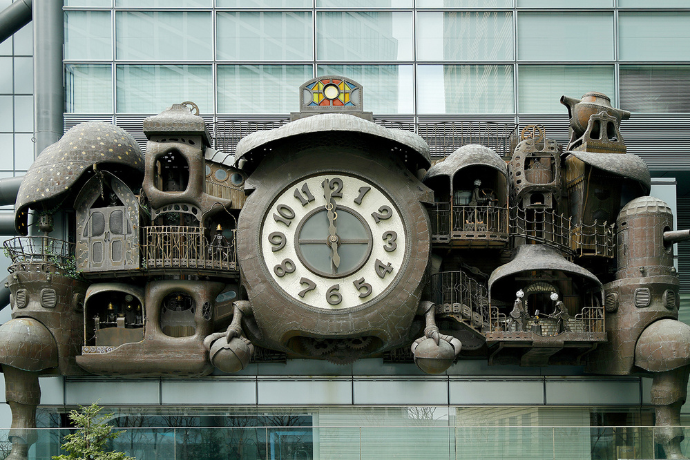 日テレ大時計は宮崎駿デザイン。日に数回からくり仕掛けが作動。