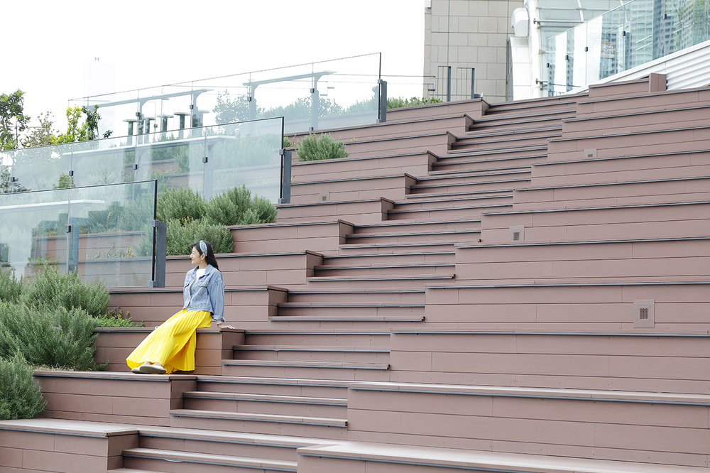 タワー棟の大階段はゆっくり座って水辺の眺めを楽しめる。