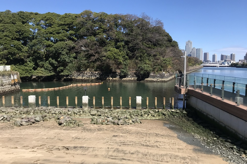 水辺には干潟も整備されている。正面の緑は浜離宮恩賜庭園。