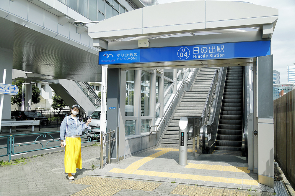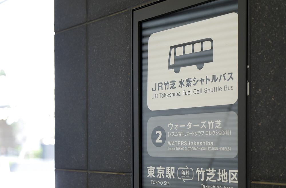 メズム東京のエントランス付近から無料のJR竹芝水素シャトルバスに乗車し、日の出ふ頭バス停へ。日の出駅へは徒歩ですぐ。
