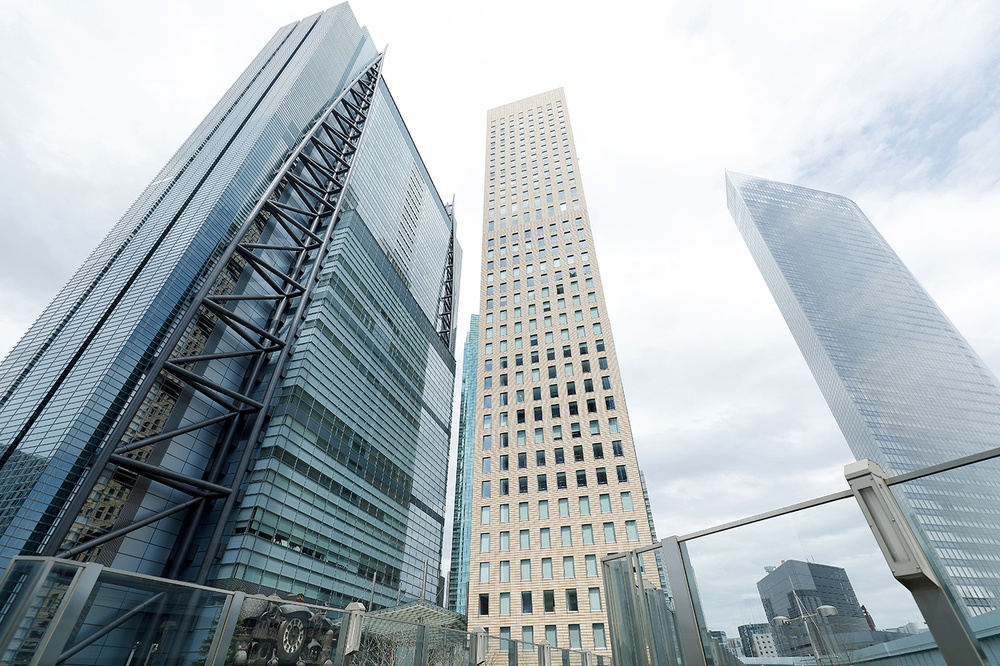 左から日テレタワー、資生堂汐留オフィスとロイヤルパークホテルが入る汐留タワー、電通本社ビル。