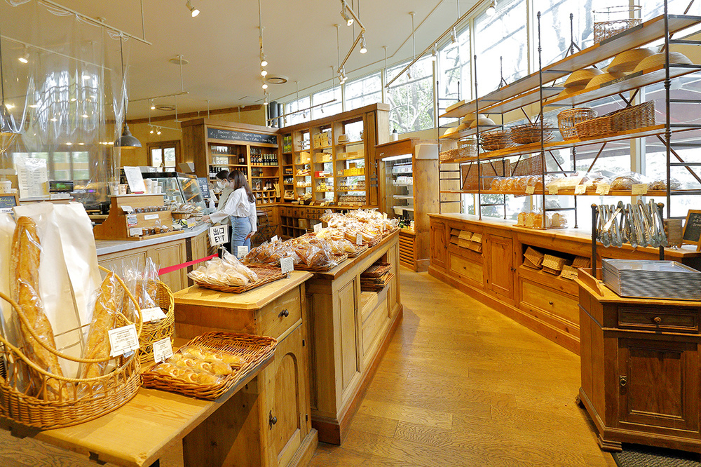 店に入ると焼きたてパンがずらりと並ぶベーカリーが出迎える。隣ではせっせとパンを焼く職人の姿も見られる。
