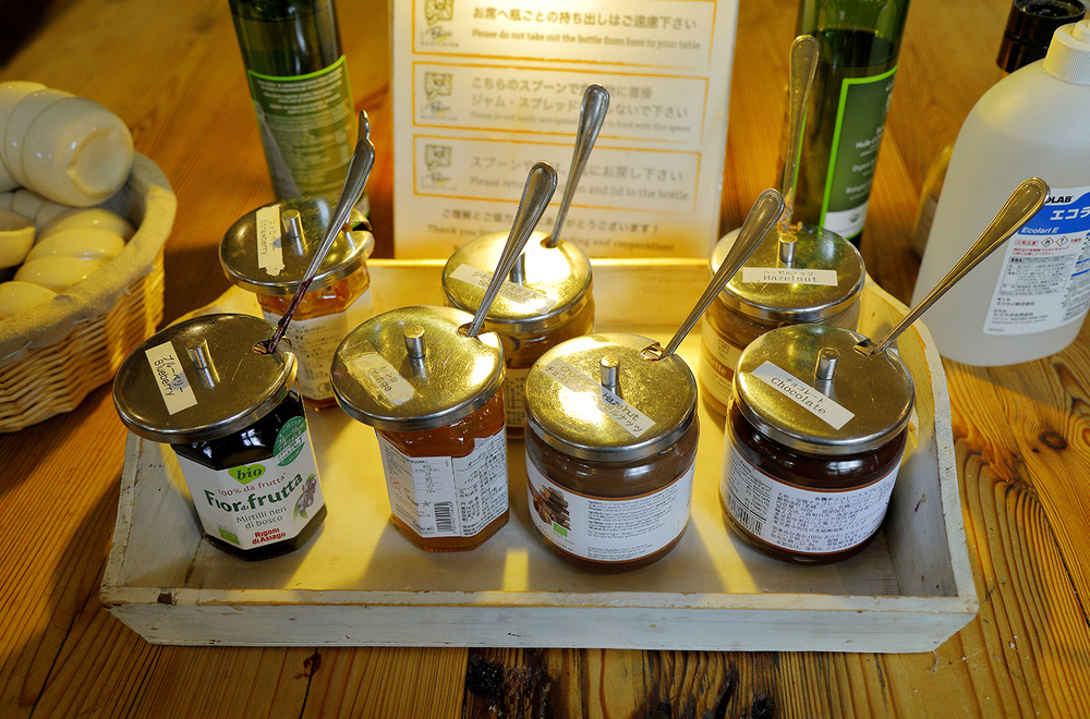 ジャムバーにさまざまなジャムやスプレッドが用意されている。