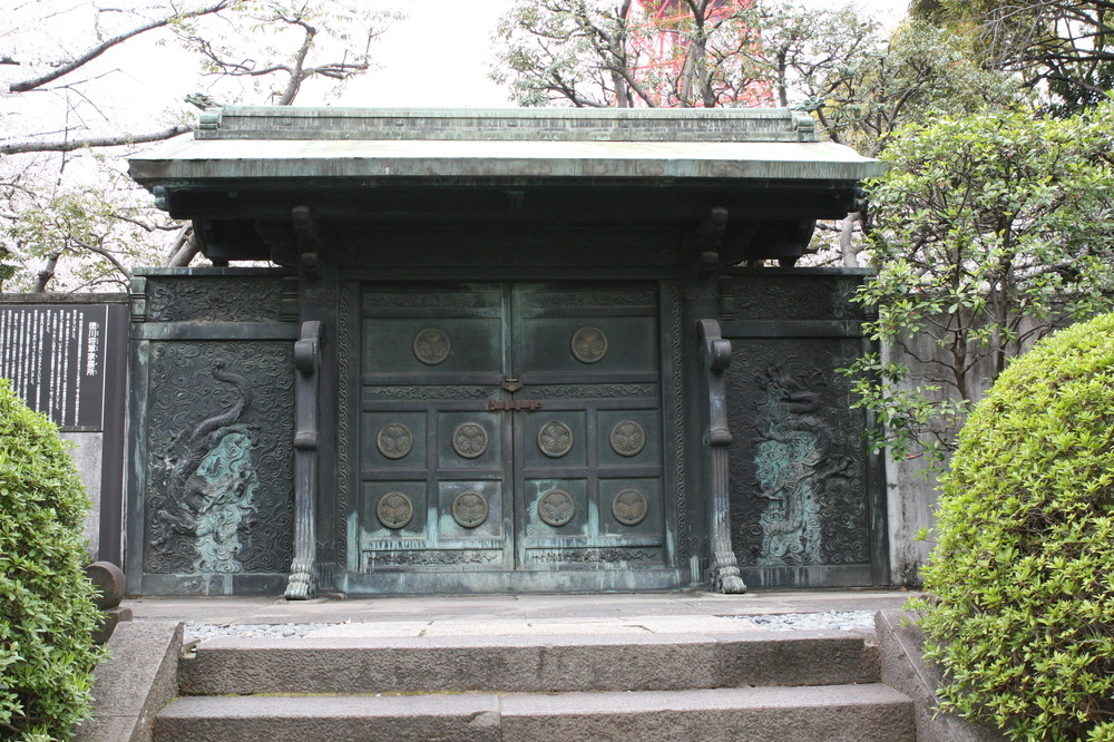 将軍家墓所の前にある鋳抜門は、戦前まで六代将軍家宣公の中門であった青銅製。葵のご紋や昇り龍、下り龍が鋳抜かれている。