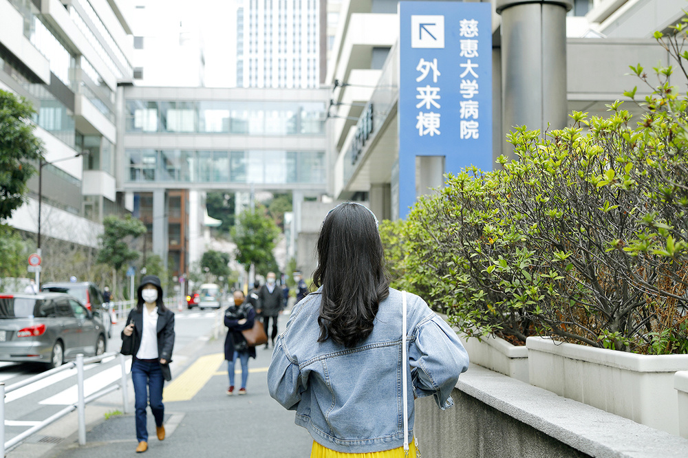 慈恵大学付属病院の間を抜けていく。