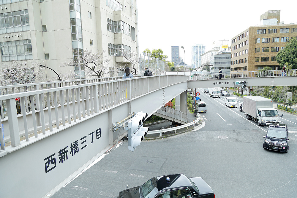 西新橋三丁目の交差点で、歩道橋を斜めに渡って左折。