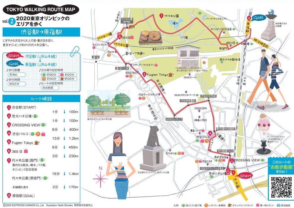 若者が集まるJR山手線渋谷駅から、おしゃれな奥渋谷をめぐり、2回の東京オリンピックに深く結びつく代々木公園エリアからJR山手線の原宿駅までを歩くコース。