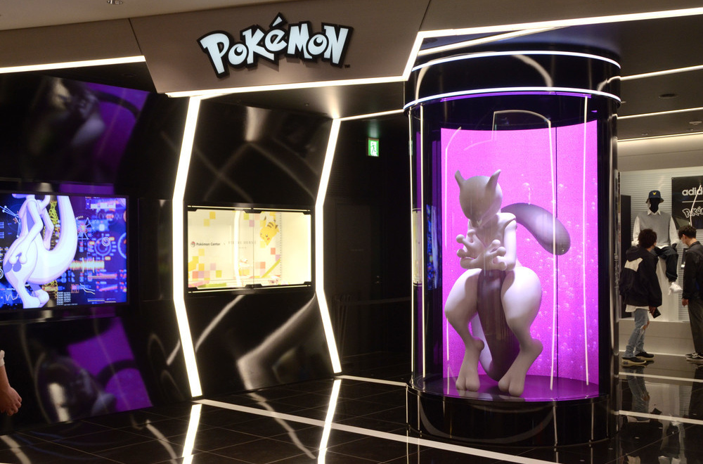 入口で眠っているミュウツーが出迎えてくれるポケモンセンターシブヤ