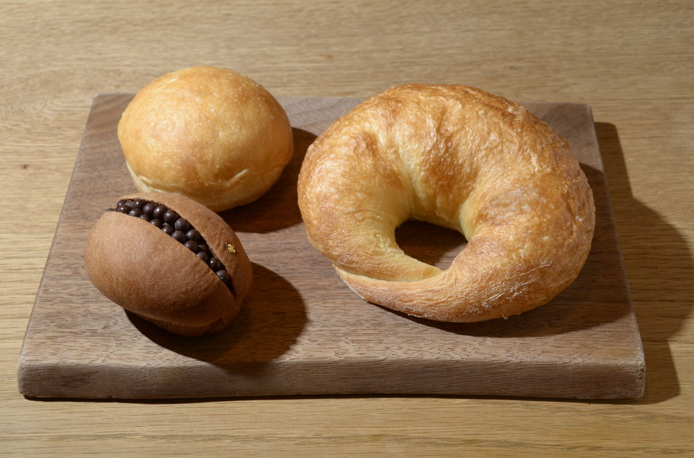左からクロカンショコラ、あんぱん(粒あん、白こしあんの2種)、100%=ソンプルサン