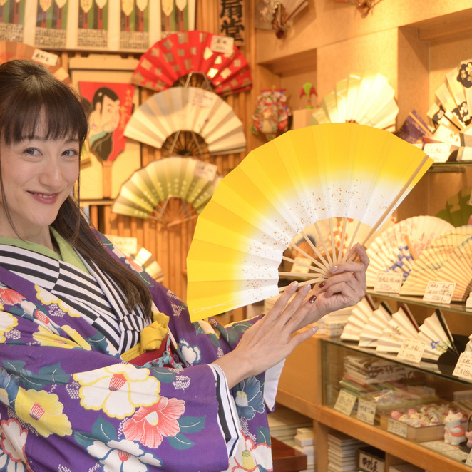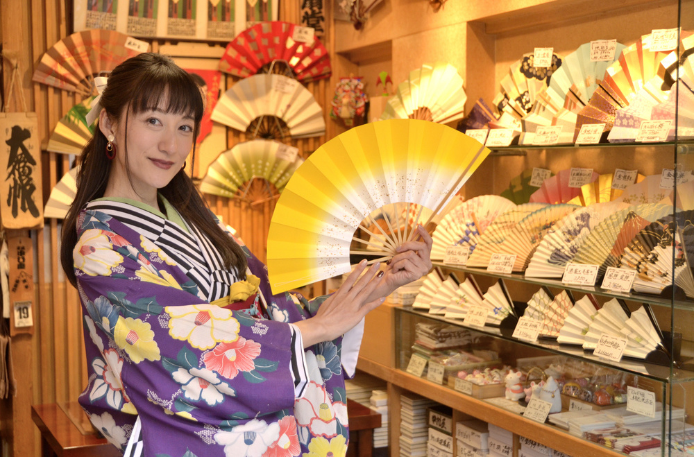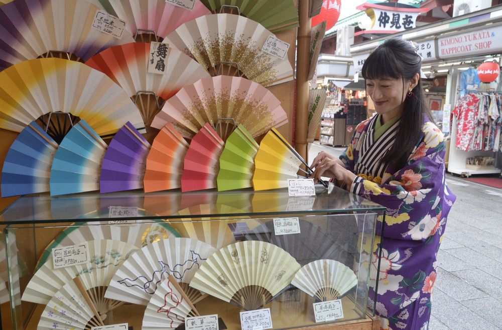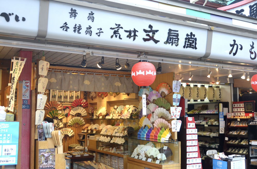 舞扇の老舗荒井文扇堂。四季の絵柄が美しい。近くに雷門店もある。