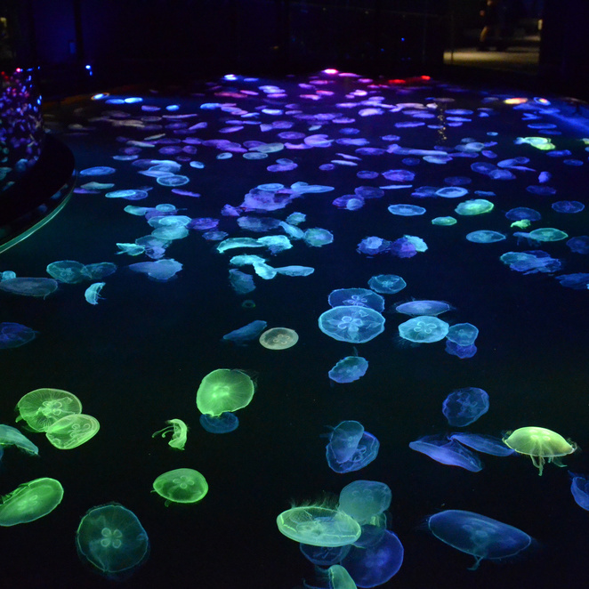 さまざまな種類のクラゲコーナー。約500匹のミズクラゲを展示する幻想的なビッグシャーレは見もの。