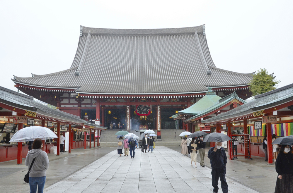 飛鳥時代から1400年近い歴史をもつ観音寺です。628年に隅田川の投網の中に入ったという観音像をご本尊とし、昭和20(1945)年の東京大空襲で本堂が消失した際にも、ご本尊は土中深く埋めた天水鉢の中に安置され、無事でした。源頼朝、足利尊氏、徳川家康など名だたる武将らにも庇護され、武運を祈念したといわれます。境内には本堂のほかに、五重塔、薬師堂など多くのお堂が建っています。浅草の庶民文化は浅草寺を中心に花開きました。