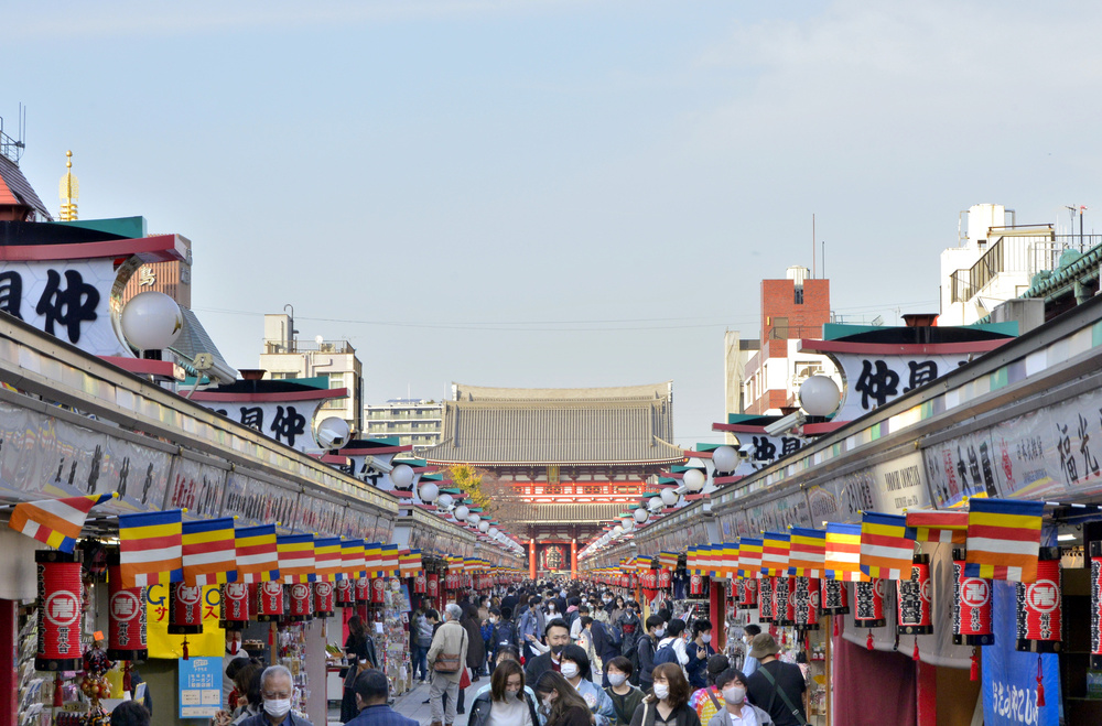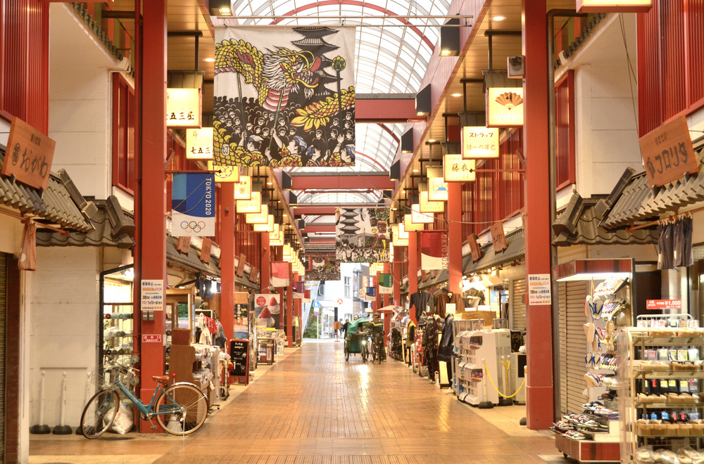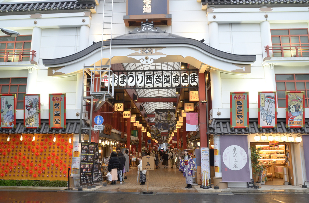 雷門から宝蔵門まで、約250mにわたる浅草寺の表参道の両側に朱塗りの店舗が立ち並んでいます。参拝客が増え、付近の住民に、境内の清掃などの役を課す代わりに参道に出店の権利を与えたのが始まりで、300年以上の歴史があります。現在89の店舗があり、伝統工芸品や浅草ならではの菓子の店なども多く、外国人にも人気。