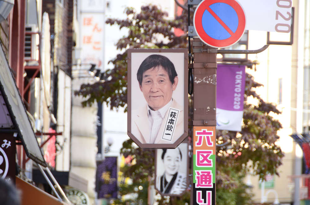 六区通りの街灯には、浅草ゆかりの有名人の写真が飾られている。