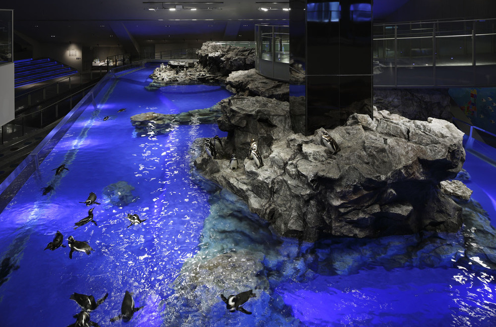 国内最大級、屋内開放型水槽で泳ぐマゼランペンギン。上下横から観察できる。