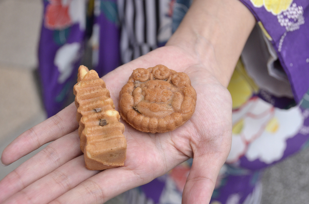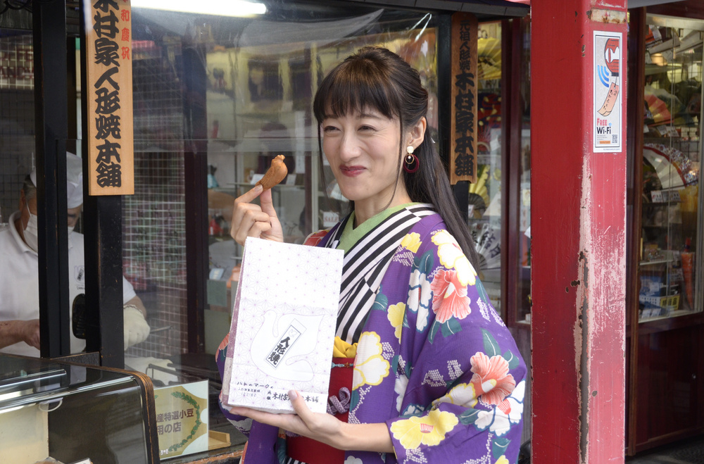 明治元年から続く人形焼の店。北海道十勝産の小豆の餡を香ばしくふわふわの皮が包み、浅草ゆかりの五重塔、提灯、雷様、鳩の4種の楽しい形は、初代のアイデア。浅草土産に最適です。カステラ焼きや瓦せんべいも販売しています。