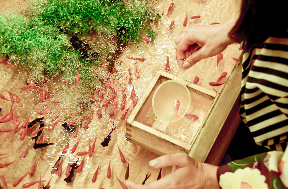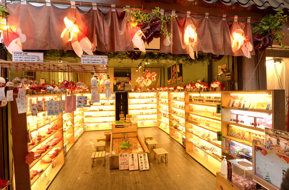 浅草きんぎょは、中央の大きな水槽で金魚すくいができ、周囲には金魚をモチーフにしたかわいい雑貨が売られている。