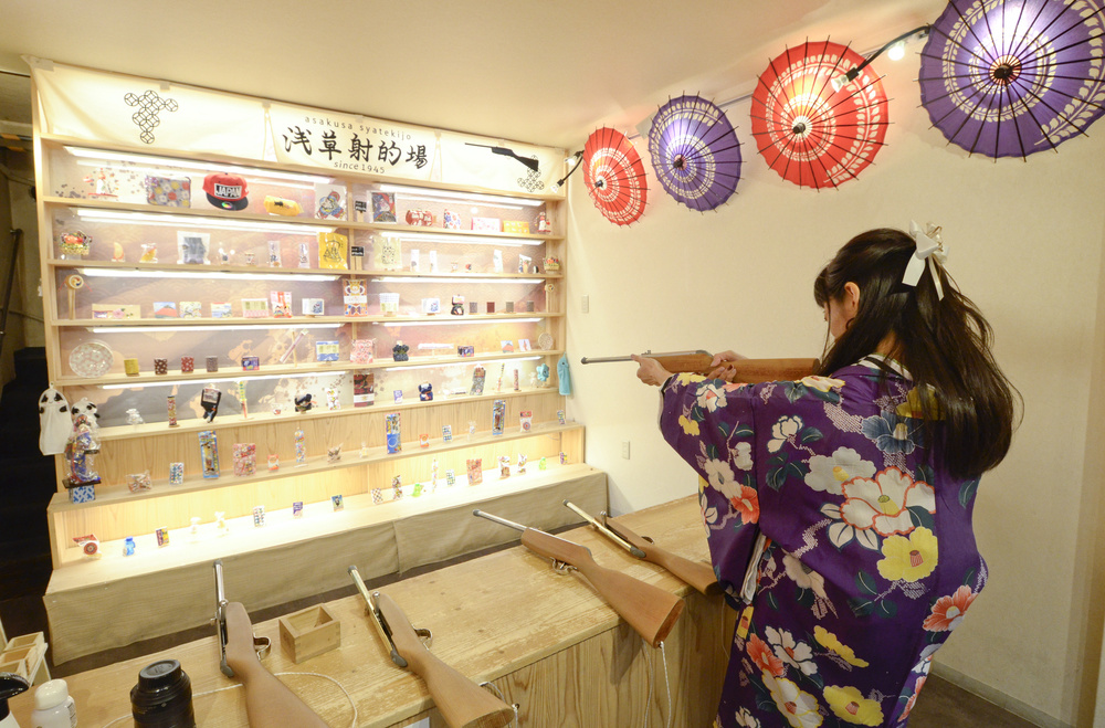花月堂の隣には射的場もあり、350円で5発打てる。景品はポーチやショットグラスなどなかなかおしゃれ。