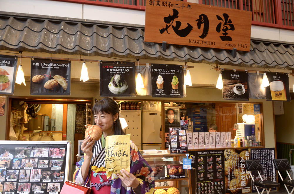 ジャンボめろんぱんで有名な店。独自の発酵技術で大きく膨らませたメロンパンは外はさくさく中はふわふわ。浅草名物のひとつとなっています。めろんぱんの店の隣には、同じく花月堂が経営する射的場があり、向かいには金魚すくいができる「浅草きんぎょ」。この3軒で縁日の気分が盛り上がります。
